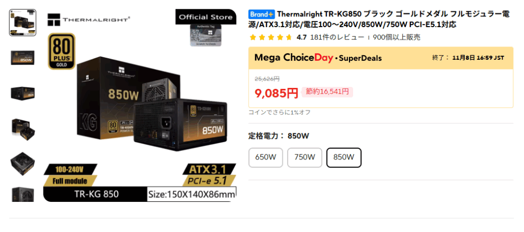 これも実際に自分で愛用している850W電源です。1万円切りでPCIE5.1とATX3.1の電源は