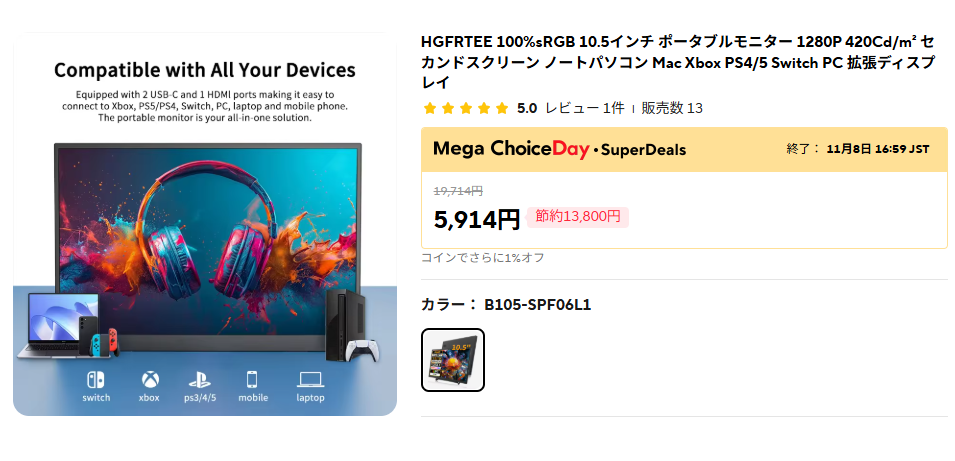 フルHD、1920*1280Pでリフレッシュレートが60Hzと必要充分以上の性能のモバイルモニターが、